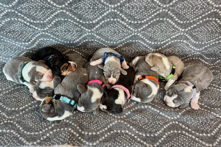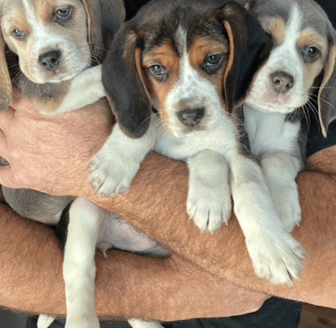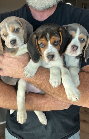 Beagles come in two different sizes, 13" and 15". Our parents are between 12" and 14" so we breed on the smaller end. We breed several colors including the traditional tricolor (black, tan, and white), blue (silver) tricolor (dilute black, tan, and white), chocolate (chocolate, tan, and white), and lilac (dilute chocolate, tan, white) beagles. The cost for our beagles is $1700 for the traditional black/chocolate tricolors and $2200 for the blue/silver or lilac (lighter colored beagles) colors. All of our puppies come with AKC limited registration, first set of shots, well puppy vet check, and a one year health guarantee. We treat our puppies with deworming every 2 weeks and take them to the vet at 6-8 weeks for their first shots and wellness examinations. All of the parents of our puppies have been health tested through Embark. The results of those are available upon request. AKC microchipping is also available for those families desiring this service and the microchip can then be registered through AKC reunite for a small one-time fee.